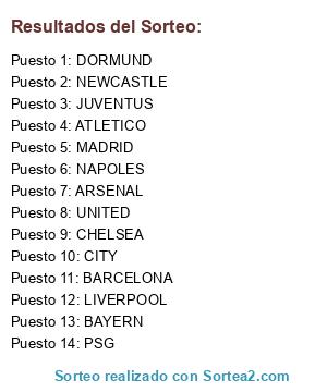 Lista de participantes: ATLETICO, MADRID, BARCELONA, NEWCASTLE, LIVERPOOL, CITY, UNITED, ARSENAL, CHELSEA, NAPOLES, JUVENTUS, PSG, BAYERN, DORMUND.