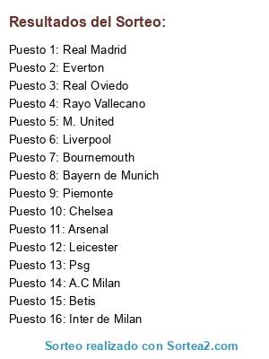 Lista de participantes: Inter de Milan, Bournemouth, Liverpool, Piemonte, Leicester, Betis, Bayern de Munich, Real Oviedo, M. United, Real Madrid, Psg, A.C Milan, Everton, Arsenal, Rayo Vallecano, Chelsea.