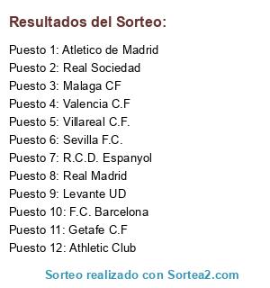 Lista de participantes: Athletic Club, F.C. Barcelona, Villareal C.F., R.C.D. Espanyol, Real Madrid, Real Sociedad, Getafe C.F, Valencia C.F, Sevilla F.C., Malaga CF, Levante UD, Atletico de Madrid.
