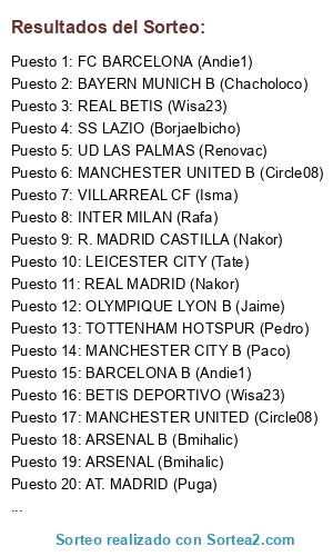 Lista de participantes: MANCHESTER CITY (Paco), OLYMPIQUE LYON (Jaime), BORUSSIA DORTMUND (Ivanizquierdo), ARSENAL (Bmihalic), MANCHESTER UNITED (Circle08), UD LAS PALMAS (Renovac), BAYERN MUNICH (Chacholoco), FC BARCELONA (Andie1), JUVENTUS (CBSory), PSG (Alforlan), REAL MADRID (Nakor), AJAX (Ivanbronx), VALENCIA CF (Benja), SS LAZIO (Borjaelbicho), AT. MADRID (Puga), REAL BETIS (Wisa23), LEICESTER CITY (Tate), VILLARREAL CF (Isma), BAYER LEVERKUSEN (Troska), LIVERPOOL FC (Zurante), AS ROMA (Davidbrocha), AC MILAN (Fronko), INTER MILAN (Rafa), TOTTENHAM HOTSPUR (Pedro), OLYMPIQUE LYON B (Jaime), MANCHESTER CITY B (Paco), MANCHESTER UNITED B (Circle08), AT. MADRID B (Puga), VILLARREAL B (Isma), BAYERN MUNICH B (Chacholoco), LAS PALMAS B (Renovac), VALENCIA B (Benja), JUVENTUS B (CBSory), PSG B (Alforlan), BARCELONA B (Andie1), ARSENAL B (Bmihalic), R. MADRID CASTILLA (Nakor), BETIS DEPORTIVO (Wisa23).