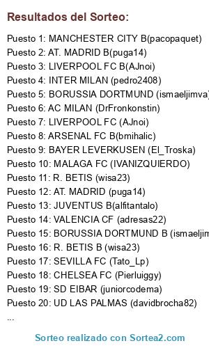 Lista de participantes: AC MILAN (DrFronkonstin), MANCHESTER UTD (Circle08), ARSENAL FC (bmihalic), MANCHESTER CITY (pacopaquet), R. OVIEDO (Girones_Canarios), LIVERPOOL FC (AJnoi), JUVENTUS (alfitantalo), CELTIC FC (el_thatanka), MALAGA FC (IVANIZQUIERDO), INTER MILAN (pedro2408), BORUSSIA DORTMUND (ismaeljimva), AT. MADRID (puga14), R. BETIS (wisa23), UD LAS PALMAS (davidbrocha82), FC BARCELONA (bornez45), BAYER LEVERKUSEN (El_Troska), CHELSEA FC (Pierluiggy), SEVILLA FC (Tato_Lp), SD EIBAR (juniorcodema), ATHLETIC CLUB (renovac), VALENCIA CF (adresas22), R. MADRID (Montxo91), AT. MADRID B(puga14), R. BETIS B (wisa23), MANCHESTER UTD B(Circle08), ARSENAL FC B(bmihalic), MANCHESTER CITY B(pacopaquet), R. OVIEDO B(Girones_Canarios), LIVERPOOL FC B(AJnoi), JUVENTUS B(alfitantalo), INTER MILAN B (pedro2408), BORUSSIA DORTMUND B (ismaeljimva).