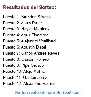 Lista de participantes: Alejandro Vouilloud, Alejo Molina, Gaston Jerez, Gastón Romeo, PIpe Orozco, Alany Pame, Agus Finamore, Brandon Silveira, Alexandro Ramos, Agustín Distel, Carlos Andres Reyes, Heyler Martinez.