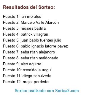 Lista de participantes: Marcelo Valle Alarcón, patrick villagran, alex aguirre, pablo ignacio latorre pavez, moises badilla, juan pablo fuentes julio, diego sepulveda, sebastian maldonado, sebastian alejandro, ian morales, osvaldo jauregui, mejor perdedor.