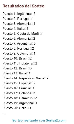 Lista de participantes: Alemania 1, Argentina 1, Belgica 1, Brasil 1, Camerun 1, Chile 1, Colombia 1, Costa de Marfil 1, España 1, Estados Unidos 1, Francia 1, Holanda 1, Inglaterra 1, Italia 1, Mexico 1, Polonia 1, Portugal 1, Republica Checa 1, Rusia 1, Suecia 1, Suiza 1, Turquia 1, Uruguay 1, Alemania 2, Argentina 2, Belgica 2, Brasil 2, Camerun 2, Chile 2, Colombia 2, Costa de Marfil 2, España 2, Estados Unidos 2, Francia 2, Holanda 2, Inglaterra 2, Italia 2, Mexico 2, Polonia 2, Portugal 2, Republica Checa 2, Rusia 2, Suecia 2, Suiza 2, Turquia 2, Uruguay 2, Alemania 3, Argentina 3, Belgica 3, Brasil 3, Camerun 3, Chile 3, Colombia 3, Costa de Marfil 3, España 3, Estados Unidos 3, Francia 3, Holanda 3, Inglaterra 3, Italia 3, Mexico 3, Polonia 3, Portugal 3, Republica Checa 3, Rusia 3, Suecia 3, Suiza 3, Turquia 3, Uruguay 3, Alemania 4, Argentina 4, Belgica 4, Brasil 4, Colombia 4, Costa de Marfil 4, España 4, Francia 4, Holanda 4, Inglaterra 4, Italia 4, Portugal 4, Suecia 4.