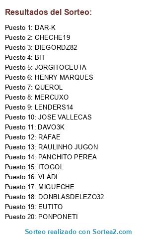 Lista de participantes: DIEGORDZ82, RAULINHO JUGON, DAR-K, MERCUXO, VLADI, CHECHE19, LENDERS14, ITOGOL, QUEROL, PONPONETI, JOSE VALLECAS, RAFAE, EUTITO, DAVO3K, BIT, HENRY MARQUES, PANCHITO PEREA, JORGITOCEUTA, MIGUECHE, DONBLASDELEZO32.