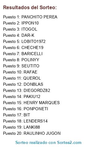 Lista de participantes: DIEGORDZ82, DAR-K, RAULINHO JUGON, CHECHE19, LENDERS14, POLINYY, PONPONETI, QUEROL, ITOGOL, PANCHITO PEREA, HENRY MARQUES, LANKI88, BIT, DONBLAS, IPPON10, RAFAE, SEUTITO, BARICELLI, LOBITO1972, PAKIU12.