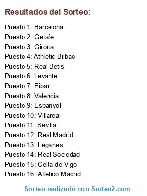 Lista de participantes: Real Madrid, Athletic Bilbao, Atletico Madrid, Real Sociedad, Real Betis, Valencia, Villareal, Barcelona, Espanyol, Celta de Vigo, Getafe, Girona, Leganes, Sevilla, Levante, Eibar.