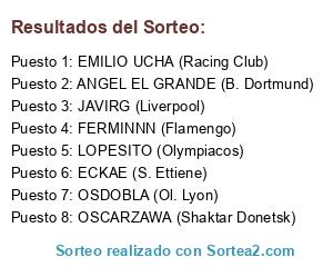Lista de participantes: FERMINNN (Flamengo), EMILIO UCHA (Racing Club), ECKAE (S. Ettiene), LOPESITO (Olympiacos), OSDOBLA (Ol. Lyon), ANGEL EL GRANDE (B. Dortmund), JAVIRG (Liverpool), OSCARZAWA (Shaktar Donetsk).