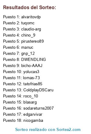 Lista de participantes: ColdplayDSCaru, tuqomc, manuc, pirustereo89, DWENDLING, gnp_12, bicho-AAAJ, sodareturns2007, roco_10, claudio-arg, yolucas3, nicogamba, lomas-73, chino_9, tatofrias85, blasarg, alvaritovdp, edgarvivar.