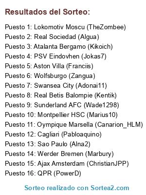 Lista de participantes: Sunderland AFC (Wade1298), Real Betis Balompie (Kentik), Werder Bremen (Marbury), Swansea City (Adonai11), Cagliari (Pabloaquino), Oympique Marsella (Canarion_HLM), PSV Eindovhen (Jokas7), Real Sociedad (Algua), Atalanta Bergamo (Kikoich), QPR (PowerD), Wolfsburgo (Zangua), Montpellier HSC (Marius10), Aston Villa (Franciis), Sao Paulo (Alna2), Lokomotiv Moscu (TheZombee), Ajax Amsterdam (ChristianJPP).