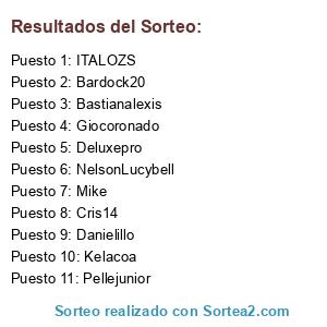Lista de participantes: Bardock20, Cris14, Kelacoa, Deluxepro, NelsonLucybell, Bastianalexis, ITALOZS, Giocoronado, Pellejunior, Danielillo, Mike.