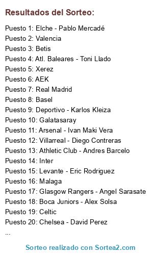 Lista de participantes: Levante - Eric Rodriguez, Wolves - Eric Cristofol, Deportivo - Karlos Kleiza, Boca Juniors - Alex Solsa, Arsenal - Ivan Maki Vera, Barcelona - Toni Vidal, Chelsea - David Perez, Glasgow Rangers - Angel Sarasate, Blackburn Rovers - Sergio Manucho, Sabadell - Jose Antonio Alcazar, Athletic Club - Andres Barcelo, PSG - Alejandro Rubio Valle, Rayo Vallecano - Miguel Huertas, Atl. Baleares - Toni Llado, Elche - Pablo Mercadé, Villarreal - Diego Contreras, River Plate, AEK, At.Madrid, Valencia, Galatasaray, Celtic, FC Schalke, Betis, Union Estepona, Basel, Real Madrid, Juventus, Malaga, Inter, Xerez, Sevilla.