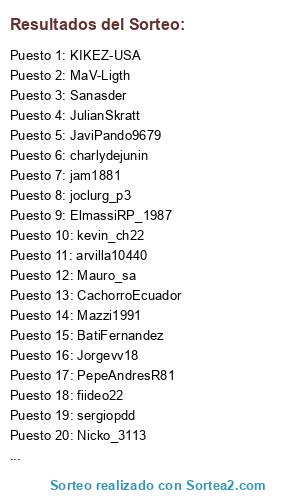 Lista de participantes: Mazzi1991, JulianSkratt, Barrazacod, Franjav93, JaviPando9679, BatiFernandez, Sanasder, Nicko_3113, MaV-Ligth, Jorgevv18, FeliFC9, PepeAndresR81, Argentowarrior82, Nikiarg, arvilla10440, Bunnygarcia, jam1881, joclurg_p3, Marceos_89, Jam-pipe04, martinchocai, ElmassiRP_1987, Moroslucas, CachorroEcuador, Mauro_sa, Rowdy_Arg, charlydejunin, sergiopdd, fiideo22, Iván_eroles, KIKEZ-USA, kevin_ch22.