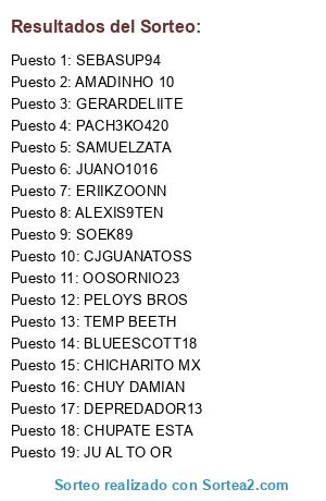 Lista de participantes: AMADINHO 10, OOSORNIO23, CHUPATE ESTA, TEMP BEETH, JUANO1016, CJGUANATOSS, CHUY DAMIAN, CHICHARITO MX, BLUEESCOTT18, DEPREDADOR13, ALEXIS9TEN, PELOYS BROS, SEBASUP94, SAMUELZATA, PACH3KO420, JU AL TO OR, SOEK89, ERIIKZOONN.