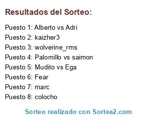 Lista de participantes: kaizher3, wolverine_rms, marc, colocho, Fear, Palomillo vs saimon, Alberto vs Adri, Mudito vs Ega.