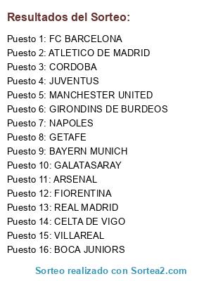 Lista de participantes: CORDOBA, BOCA JUNIORS, MANCHESTER UNITED, REAL MADRID, GALATASARAY, BAYERN MUNICH, ATLETICO DE MADRID, JUVENTUS, GETAFE, FIORENTINA, ARSENAL, NAPOLES, CELTA DE VIGO, FC BARCELONA, GIRONDINS DE BURDEOS, VILLAREAL.