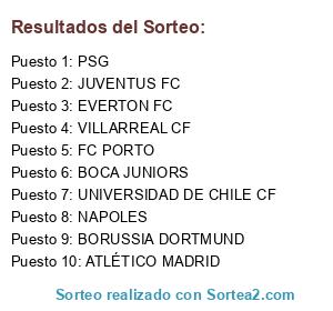 Lista de participantes: BOCA JUNIORS, UNIVERSIDAD DE CHILE CF, JUVENTUS FC, FC PORTO, EVERTON FC, ATLÉTICO MADRID, BORUSSIA DORTMUND, PSG, NAPOLES, VILLARREAL CF.