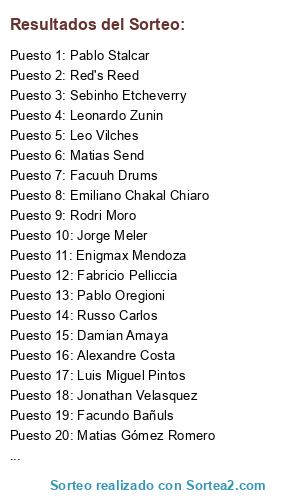 Lista de participantes: Leonardo Zunin, Facundo Bañuls, Luis Miguel Pintos, Pablo Stalcar, Pablo Oregioni, Leandro Scatolon, Jonathan Velasquez, Emiliano Chakal Chiaro, Sebinho Etcheverry, Enigmax Mendoza, Fabricio Pelliccia, Alexandre Costa, Nahuel Zapata, Rodri Zamora, Ivan Casa, Karlithox Napolitano Almiron, Brian Gonzalez, Diego Ignacio Salvador, Jorge Meler, Leo Vilches, Matias Gómez Romero, Matias Send, Mauro Man, Russo Carlos, Damian Amaya, Rodri Moro, Sebastian Pes, Andres Vique, Red's Reed, Juan de la Bahía, Francisco Orellana Galvez, Facuuh Drums.