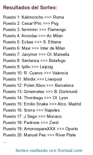 Lista de participantes: AmonospareXXX >>> Oporto, Anicolao >>> Ac Milan, Cexar1Pro >>> Psg, Eckae >>> S. Ettiene, Emilio Snake >>> Atco. Madrid, ferminnn >>> Flamengo, Frakotirador >>> Benfica, Iborra >>> Napoles, Ipillo >>> Leipzig, Javymor >>> Ol. Marsella, Kalimoncho >>> Roma, Lu1z4o >>> Ajax, Mindix >>> Liverpool, Manuel Pes >>> River Plate, Polen Xbox >>> Barcelona, Maxi >>> Inter de Milan, Qmemetes >>> B. Dortmund, R. Cuervo >>> Valencia, J Sego >>> Monaco, Sentenza >>> Botafogo, Padrone >>> Zenit, Thordrago >>> Ol. Lyon, Ueye >>> Arsenal, Unai >>> Schalke04.