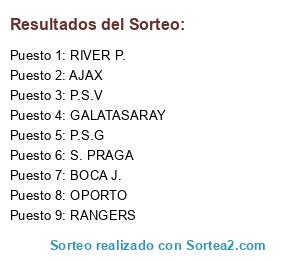 Lista de participantes: AJAX, GALATASARAY, RIVER P., BOCA J., OPORTO, RANGERS, P.S.G, S. PRAGA, P.S.V.