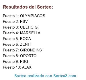 Lista de participantes: MARSELLA, CELTIC G., BOCA, PSG, OLYMPIACOS, PSV, GIRONDINS, OPORTO, AJAX, ZENIT.