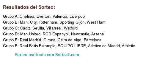 Lista de participantes: Barcelona, Real Madrid, Cádiz, Man.United, Everton, Real Betis Balompie, Athletic, West Ham, Tottenham, Man. City, Chelsea, Arsenal, Liverpool, Newcastle, Watford, EQUIPO LIBRE, Sevilla, Villarreal, Girona, Valencia, Atletico de Madrid, RCD Espanyol, Celta de Vigo, Sporting Gijón.