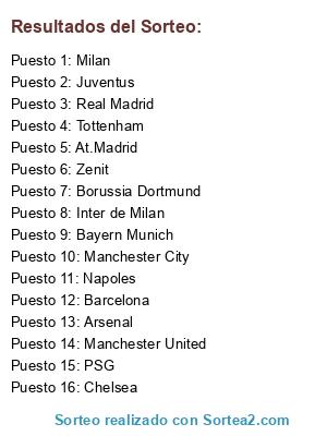 Lista de participantes: PSG, At.Madrid, Chelsea, Real Madrid, Napoles, Barcelona, Juventus, Manchester City, Milan, Arsenal, Tottenham, Bayern Munich, Inter de Milan, Borussia Dortmund, Zenit, Manchester United.