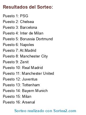 Lista de participantes: Milan, Juventus, Real Madrid, Tottenham, At.Madrid, Zenit, Borussia Dortmund, Inter de Milan, Bayern Munich, Manchester City, Napoles, Barcelona, Arsenal, Manchester United, PSG, Chelsea.