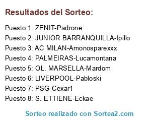 Lista de participantes: ZENIT-Padrone, PSG-Cexar1, S. ETTIENE-Eckae, AC MILAN-Amonosparexxx, OL. MARSELLA-Mardom, PALMEIRAS-Lucamontana, LIVERPOOL-Pabloski, JUNIOR BARRANQUILLA-Ipillo.