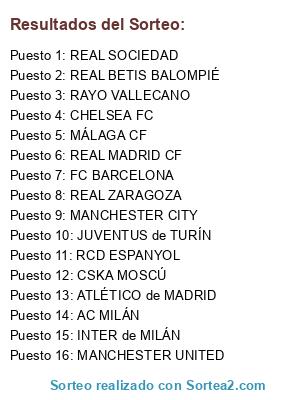 Lista de participantes: MANCHESTER CITY, CSKA MOSCÚ, RCD ESPANYOL, REAL MADRID CF, FC BARCELONA, CHELSEA FC, INTER de MILÁN, AC MILÁN, REAL SOCIEDAD, RAYO VALLECANO, JUVENTUS de TURÍN, MÁLAGA CF, REAL ZARAGOZA, MANCHESTER UNITED, REAL BETIS BALOMPIÉ, ATLÉTICO de MADRID.