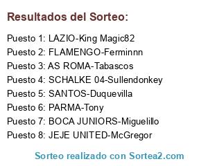 Lista de participantes: FLAMENGO-Ferminnn, BOCA JUNIORS-Miguelillo, SANTOS-Duquevilla, SCHALKE 04-Sullendonkey, PARMA-Tony, AS ROMA-Tabascos, JEJE UNITED-McGregor, LAZIO-King Magic82.