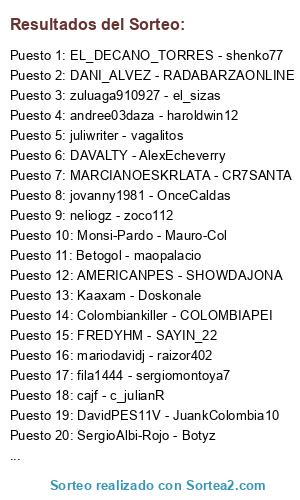Lista de participantes: zuluaga910927 - el_sizas, EL_DECANO_TORRES - shenko77, DANI_ALVEZ - RADABARZAONLINE, NICHEEFLOOW - MAFIOSOSSSS, Monsi-Pardo - Mauro-Col, cholu77 - sebasticoo, AMERICANPES - SHOWDAJONA, Colombiankiller - COLOMBIAPEI, cajf - c_julianR, DavidPES11V - JuankColombia10, jovanny1981 - OnceCaldas, fabianzionoiz - jhongarcia, andree03daza - haroldwin12, MARCIANOESKRLATA - CR7SANTA, Kaaxam - Doskonale, mariodavidj - raizor402, DAVALTY - AlexEcheverry, SergioAlbi-Rojo - Botyz, Vasco1208 - Garysnakeye, neliogz - zoco112, Betogol - maopalacio, fila1444 - sergiomontoya7, FREDYHM - SAYIN_22, TATANGO10 - juanpabloacos, juliwriter - vagalitos, naluffy - santymontoya.