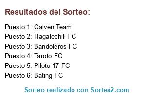 Lista de participantes: Calven Team, Hagalechili FC, Bating FC, Taroto FC, Bandoleros FC, Piloto 17 FC.