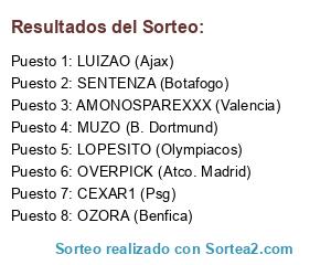 Lista de participantes: OVERPICK (Atco. Madrid), SENTENZA (Botafogo), LOPESITO (Olympiacos), OZORA (Benfica), CEXAR1 (Psg), LUIZAO (Ajax), MUZO (B. Dortmund), AMONOSPAREXXX (Valencia).