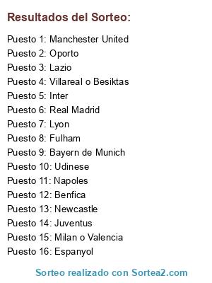 Lista de participantes: Napoles, Fulham, Udinese, Villareal o Besiktas, Bayern de Munich, Inter, Lazio, Newcastle, Oporto, Benfica, Real Madrid, Espanyol, Milan o Valencia, Lyon, Manchester United, Juventus.
