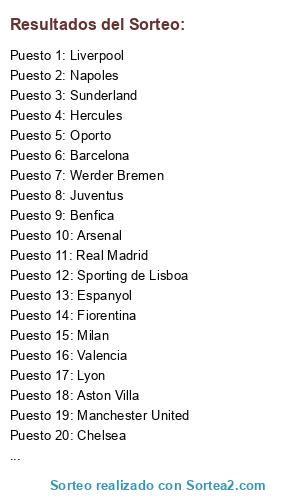 Lista de participantes: Hercules, Sevilla, Barcelona, Valencia, Villareal, Real Madrid, Espanyol, Zaragoza, Fulham, Manchester United, Liverpool, Chelsea, Aston Villa, Sunderland, Arsenal, Tottenham, Inter, Palermo, Lazio, Fiorentina, Juventus, Milan, Napoles, Udinese, PSG, Lyon, Werder Bremen, Sporting de Lisboa, Bayern de Munich, Besiktas, Oporto, Benfica.