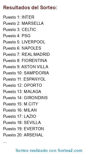 Lista de participantes: BARCELONA, REAL MADRID, MALAGA, VILLAREAL, VALENCIA, ZARAGOZA, SEVILLA, ESPANYOL, M.UNITED, LIVERPOOL, EVERTON, CHELSEA, TOTTENHAM, ARSENAL, M.CITY, ASTON VILLA, JUVENTUS, MILAN, INTER, ROMA, SAMPDORIA, FIORENTINA, NAPOLES, LAZIO, PSV, FENERBACHE, OPORTO, BENFICA, PSG, MARSELLA, CELTIC, GIRONDINS.