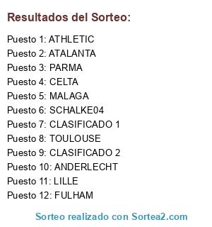 Lista de participantes: ATALANTA, FULHAM, CLASIFICADO 2, ANDERLECHT, MALAGA, ATHLETIC, LILLE, TOULOUSE, CELTA, PARMA, SCHALKE04, CLASIFICADO 1.