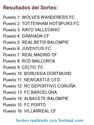 Lista de participantes: NEWCASTLE UTD, RAYO VALLECANO, BORUSSIA DORTMUND, CELTIC FC, WOLVES WANDERERS FC, RC DEPORTIVO CORUÑA, FC PORTO, GRANADA CF, REAL BETIS BALOMPIE, REAL MADRID CF, FC BARCELONA, JUVENTUS FC, RCD MALLORCA, VILLARREAL CF, ALBACETE BALOMPIE, TOTTENHAM HOTSPURS FC.