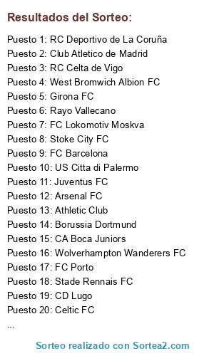 Lista de participantes: CA Boca Juniors, Wolverhampton Wanderers FC, Real Betis Balompie, Celtic FC, US Citta di Palermo, RC Deportivo de La Coruña, RCD Mallorca, Girona FC, RC Celta de Vigo, Borussia Dortmund, Real Madrid, Juventus FC, FC Porto, Athletic Club, AS Roma, FC Lokomotiv Moskva, Stade Rennais FC, CD Lugo, Rayo Vallecano, Arsenal FC, West Bromwich Albion FC, FC Barcelona, Club Atletico de Madrid, Stoke City FC.