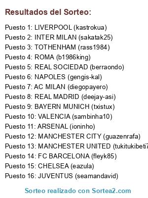 Lista de participantes: NAPOLI, MANCHESTER CITY, TOTTENHAM, INTER, BARCELONA, REAL MADRID, JUVENTUS, BAYERN MUNICH O VALENCIA.