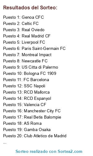 Lista de participantes: Manchester City FC, Real Betis Balompie, Celtic FC, Liverpool FC, AS Roma, US Citta di Palermo, FC Barcelona, Paris Saint-Germain FC, Bologna FC 1909, Genoa CFC, Chelsea FC, Club Atletico de Madrid, Gamba Osaka, RCD Mallorca, Montreal Impact, Real Oviedo, SSC Napoli, FC Internazionale Milano, Real Madrid CF, Cadiz CF, Newcastle FC, Eintracht Braunschweig, RCD Espanyol, Valencia CF.