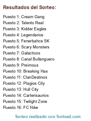 Lista de participantes: Plagios City , Twilight Zone, FC Nike , Scary Monsters, Canal Bullanguero, Hull City , Preimous , ClanDestinos, Carterisaurios , Breaking Hax, Galacticos, Fenerbahce SK, Cream Gang , Talento Real , Kidder Eagles, Legendarios.