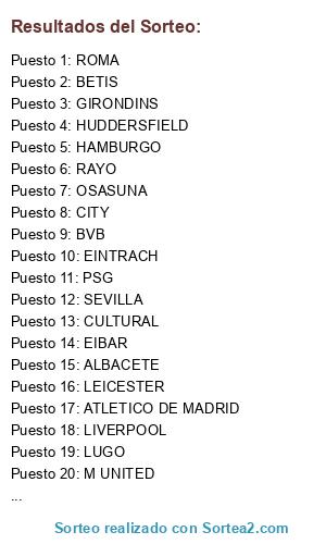 Lista de participantes: ATLETICO DE MADRID, RAYO, HUDDERSFIELD, OSASUNA, BARCELONA, EIBAR, HAMBURGO, LUGO, PSG, ALBACETE, LEGANES, BVB, CULTURAL, CITY, EINTRACH, LIVERPOOL, LEICESTER, SEVILLA, EVERTON, RED BULL, VILLAREAL, CELTA, ESPAÑOL, M UNITED, BETIS, ROMA, GIRONDINS, TORINO, JUVENTUS, GIRONA, ELIMINATORIA 2, REAL MADRID.