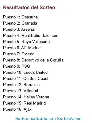 Lista de participantes: AT. Madrid, Borussia, Hellas Verona, Central Coast, Real Betis Balompié, Real Madrid, Villareal, Deportivo de la Coruña, Osasuna, Ajax, Rayo Vallecano, Granada, Arsenal, Oviedo, PSG, Leeds United.