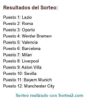 Lista de participantes: Valencia, Barcelona, Milan, Werder Bremen, Manchester City, Bayern Munich, Aston Villa, Lazio, Liverpool, Sevilla, Oporto, Roma.