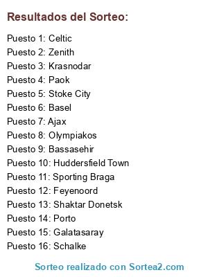 Lista de participantes: Zenith, Galatasaray, Stoke City, Olympiakos, Huddersfield Town, Paok, Krasnodar, Ajax, Basel, Sporting Braga, Porto, Bassasehir, Schalke, Feyenoord, Shaktar Donetsk, Celtic.