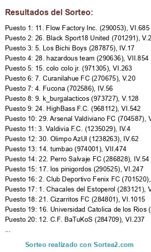 Lista de participantes: 1. Chacales del Estoperol (283121), VI.900, 2. Club Deportivo Fenix FC (701520), V.103, 3. Valdivia F.C. (1235029), IV.4, 4. Fucona (702586), IV.56, 5. Los Bichi Boys (287875), IV.17, 6. Los Cruzados de Demontre (288132), IV.34, 7. Curanilahue FC (270675), V.20, 8. LoS TesTiGoS De MaJueL (704562), V.26, 9. k_burgalacticos (973727), V.128, 10. Kchorro's F.C (288649), VI.1000, 11. Flow Factory Inc. (290053), VI.685, 12. C.F. BaTuKoS (284709), VI.237, 13. C.D. Josefina Antonia (707024), VI.269, 14. tumbao (974001), VII.474, 15. colo colo jr. (971305), VI.263, 16. Universidad Catolica de los Rios (973035), VI.620, 17. los pinigordos (290525), VI.247, 18. Deportes Futrono FC. (705223), VII.433, 19. Furia Cruzada (972038), VII.529, 20. jamaika f.c. (974336), VI.456, 21. Cizarritos FC (284801), VI.1015, 22. Perro Salvaje FC (286828), IV.54, 23. Luqas FC (283003), VII.899, 24. HighBass F.C. (968112), VI.542, 25. *>R[2]K=- TeaM (1235270), IV.15, 26. Black Sport18 United (701291), V.24, 27. Deportes Valdivia S.A (287306), VI.239, 28. hazardous team (290636), VII.854, 29. Arsenal Valdiviano FC (704587), VI.423, 30. Olimpo AzUl (1238263), IV.62.
