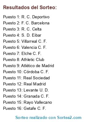 Lista de participantes: F. C. Barcelona, Real Madrid, Atlético de Madrid, Real Sociedad, Valencia C. F., S. D. Eibar, Getafe C. F., Rayo Vallecano, Córdoba C. F., Levante U. D., Athletic Club, Granada C. F., Villarreal C. F., R. C. Deportivo, R. C. Celta, Elche C. F..