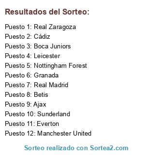 Lista de participantes: Cádiz, Leicester, Manchester United, Real Madrid, Granada, Everton, Sunderland, Nottingham Forest, Ajax, Betis, Boca Juniors, Real Zaragoza.